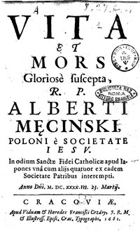 Ignacy Maciej Tłuczyński SJ - Vita Et Mors Gloriose suscepta, R. P. Alberti Męciński, Poloni e Societate Iesu: In odium Sanctæ Fidei Catholicæ apud Iapones una cum alijs quatuor ex eadem Societate Patribus interempti, Anno Domini M.DC.XXXX.III, 23. Martij. Vita R. P. Petri Skarga Poloni e Societate Iesu. dostępna w Wielkopolskiej Bibliotece Cyfrowej i na Google Books wraz z żywotem o. Piotra Skargi (Vita R. P. Petri Skarga Poloni e Societate Iesu).